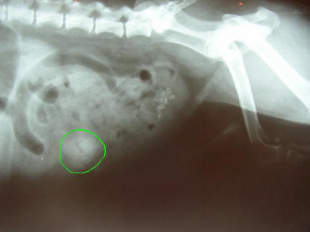 – La présence de certains corps étrangers peut être suspectée voire directement révélée par une radiographie simple: une dilatation de l’estomac et la présence d’air sur une radiographie abdominale de lapin feront très fortement suspecter la présence de trichobézoards tandis que des objets métalliques ou des os seront directement visibles sur le cliché radiographique de l’abdomen d’un chien.